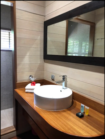 Bedroom 2: is air conditioned, has a mosquito net over two single beds which can either be set up together in a “queen size” bed configuration for a couple, or separated for kids. A closet has hanging space and shelves. A sliding door can be opened up to the rear deck, and two sets of wooden shutters can be opened for sea breeze, both shutters have mosquito nets. Bedroom 2 has a connecting door to bathroom 2.